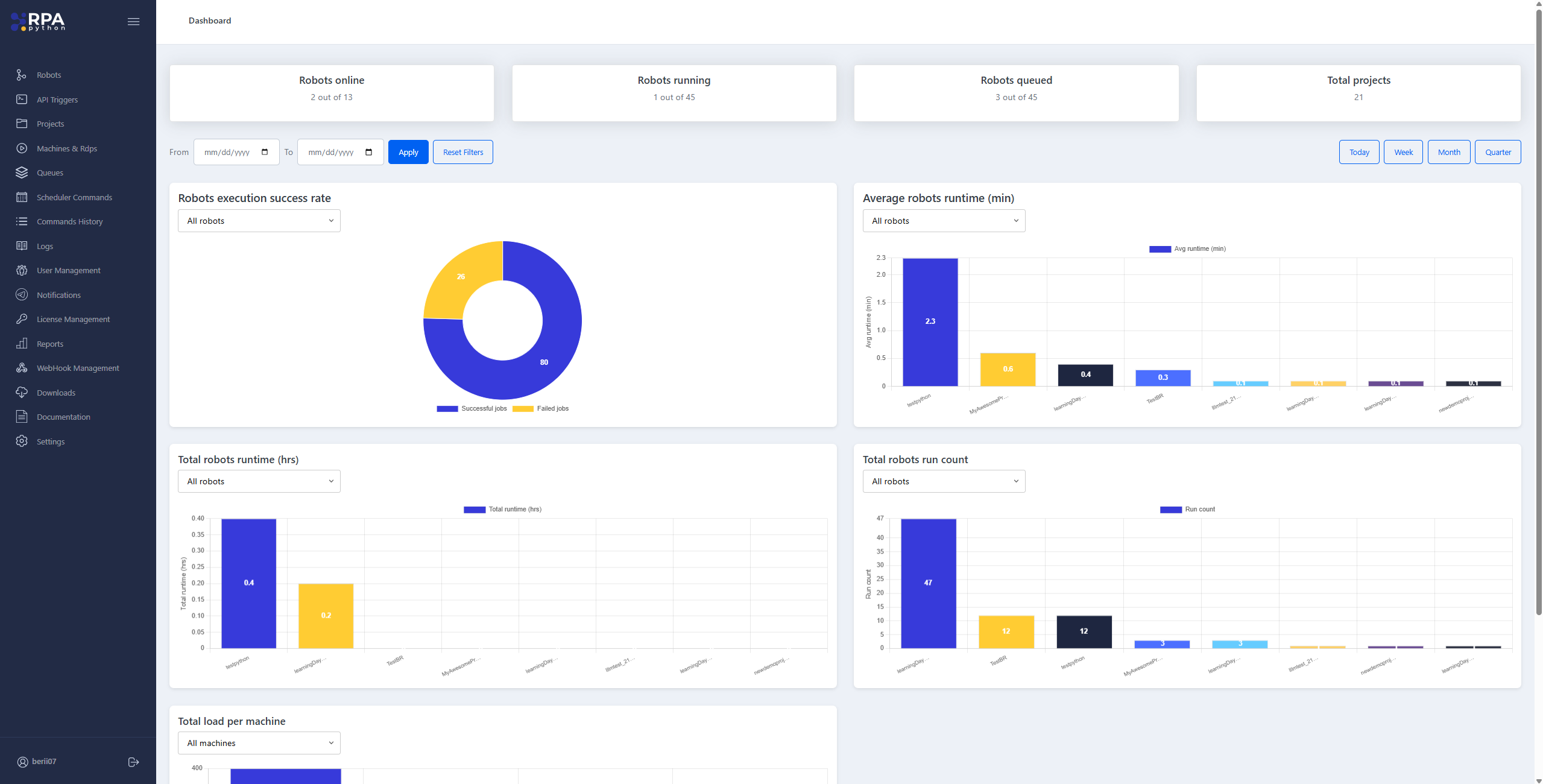 Python RPA Orchestrator has high functionality and costs 50% less than other similar products. Orchestrator provides complete governance and control to optimize enterprise automation. Key features include real-time status monitoring, alerts, actionable insights, automatic queue handling, VM and Docker management, bot version control with rollback capabilities, custom logging, detailed error reporting, and advanced batch queue processing